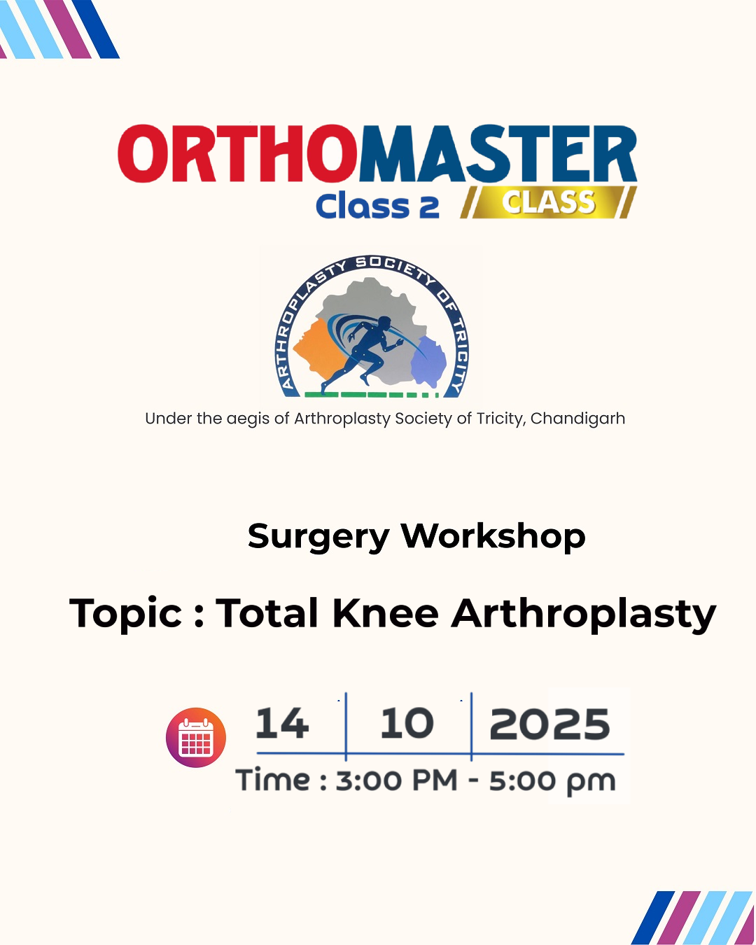 Ortho Master Class is an academic initiative hosted by the Arthroplasty Society of Tricity. Established as a national-level platform, it delivers advanced Orthopaedic training and real-time knowledge exchange to practicing orthopaedicians throughout India. Each session is meticulously designed to elevate clinical expertise, encourage adoption of the latest techniques and technologies, and ultimately enhance patient care across the orthopaedic discipline nationwide